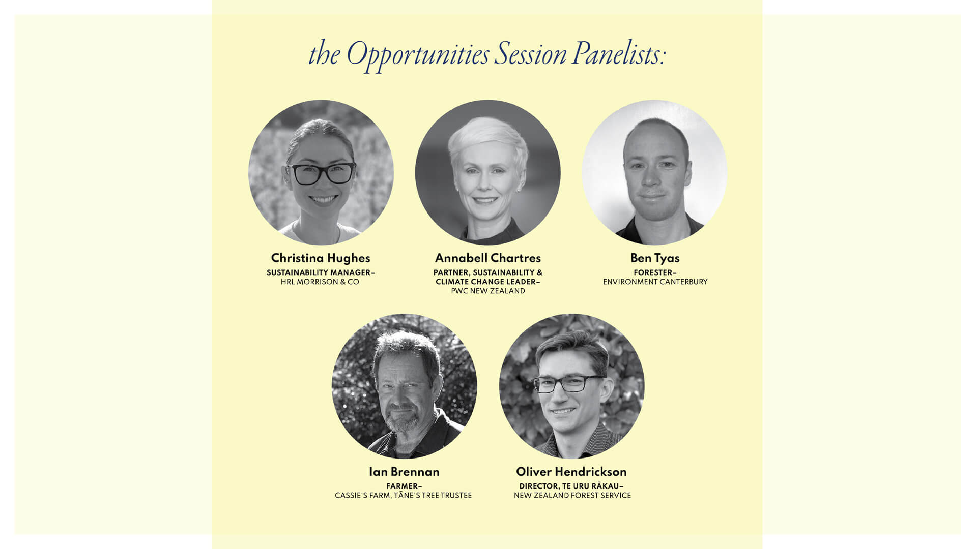 Business led panel: What’s holding us back: Opportunities & challenges for more native forest; moderated by Sir Stephen Tindall with guests; Christina Hughes, Sustainability Manager at HRL Morrison & Co, Annabelle Chartres, Partner, Sustainability & Climate Change Leader at PwC, Ben Tyas, Forester, Environment Canterbury, Ian Brennan, Farmer, Cassie’s Farm Tāne’s Tree Trustee and Oliver Hendrickson, Director, Te Uru Rākau.