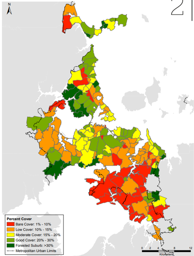– Auckland’s urban forest canopy cover by suburb, 2013. Credit Auckland Urban Ngahere Strateg