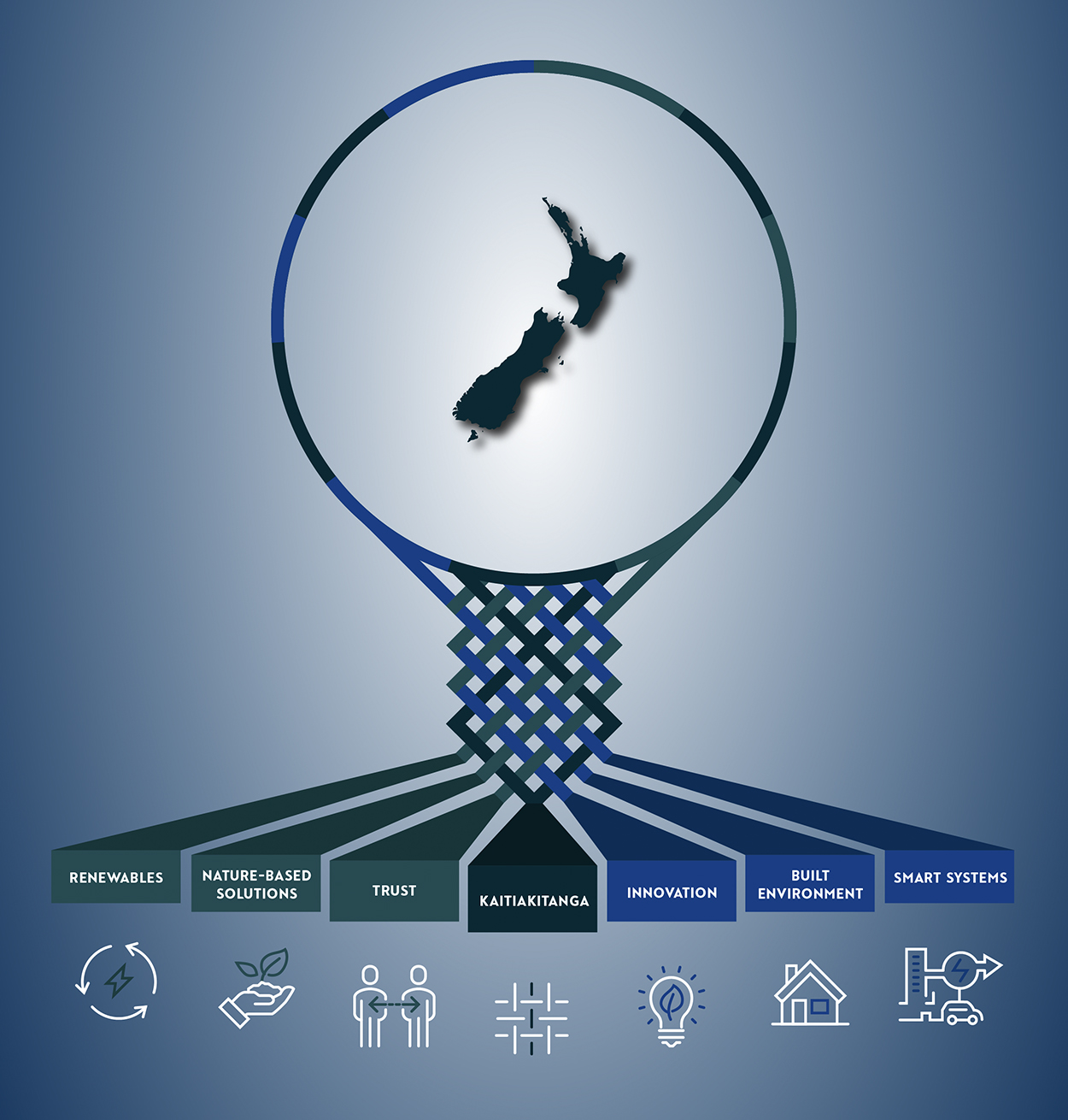 To begin walking backwards into the future, Pure Advantage has modernised its foundations. Kaitiakitanga and Trust represent the true as much as the new. These culturally and socially-orientated advantages are joined by Innovation to more accurately reflect why New Zealand consistently leads the world on social capital, transparency, lack of corruption, governance and doing business. But sound foundations are of little benefit without the right ingredients and strategies to build a better future. So, accompanying Kaitiakitanga, Trust and Innovation are four technical advantages that, if enhanced and leveraged, can guide Aotearoa through the economic reverberations of Covid-19, regenerate our natural capital, point the curve of emissions downwards and future-proof our industries in the race to decarbonise. They are our Built Environment, Nature-based Solutions, Renewables and Smart Systems.