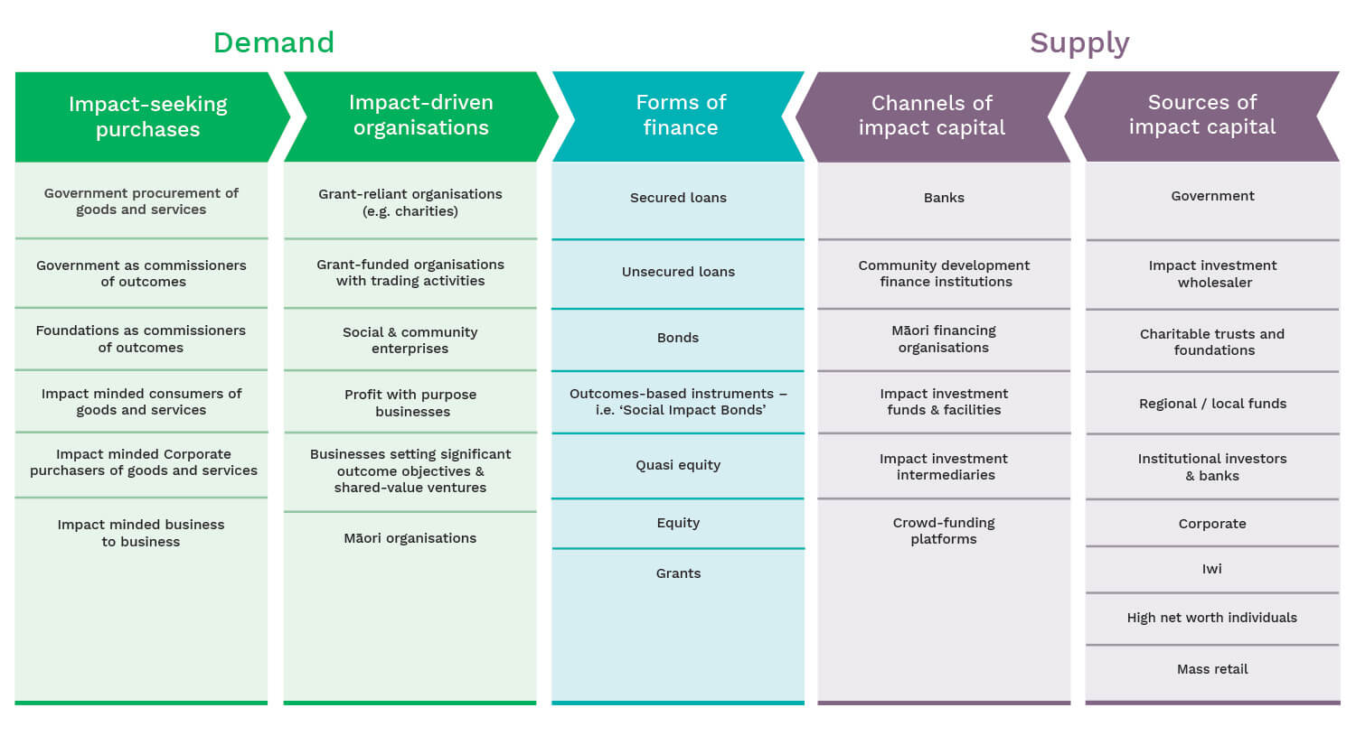 If we accept the assumption that impact investment activity will grow in Aotearoa New Zealand, we will see it increasingly span the interests of institutional investors, philanthropists, business, iwi, angel investors, charities, cooperatives, social enterprises, community organisations, public sector agencies, religious institutions, education and research institutions, and engaged citizens.