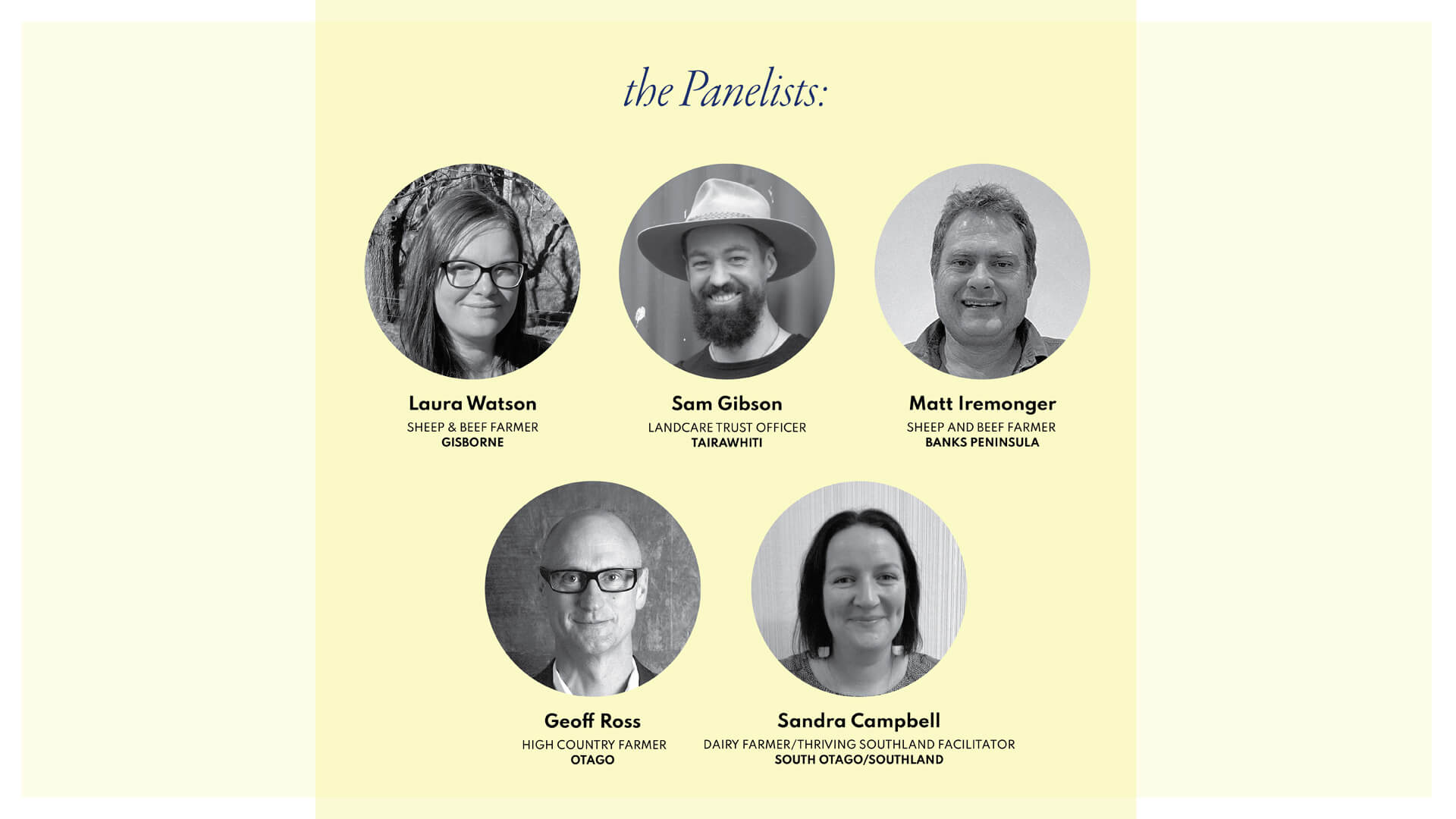 Moderated by Emeritus Professor David Norton, Kura Ngahere, Ōtautahi with guests; Laura Watson (sheep & beef farmer, Gisborne), Sam Gibson (Landcare Trust officer, Tairawhiti), Matt Iremonger (sheep and beef farmer Banks Peninsula), Geoff Ross (high country farmer, Otago), Sandra Campbell (dairy farmer and Thriving Southland facilitator, south Otago/Southland)