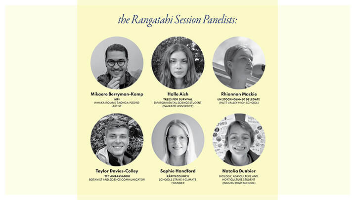 Rangatahi Panel: Let’s talk about the future; moderated by Robyn Haugh, CEO of Trees that Count with guests; Taylor Davies-Colley – TTC ambassador, botanist and Science Communicator, Sophie Handford – Kāpiti Council, Schools Strike 4 Climate Founder, Hallé Aish – Trees for Survival, environmental science student (Waikato University), Mikaere Berryman-Kamp – MPI, Whakairo and taonga pūoro Artist,. Natalia Dunbier – Biology, Agriculture and Horticulture Student (Waiuku High School), Rhiannon Mackie – United Nations Stockholm+50 delegate (Hutt Valley High School)