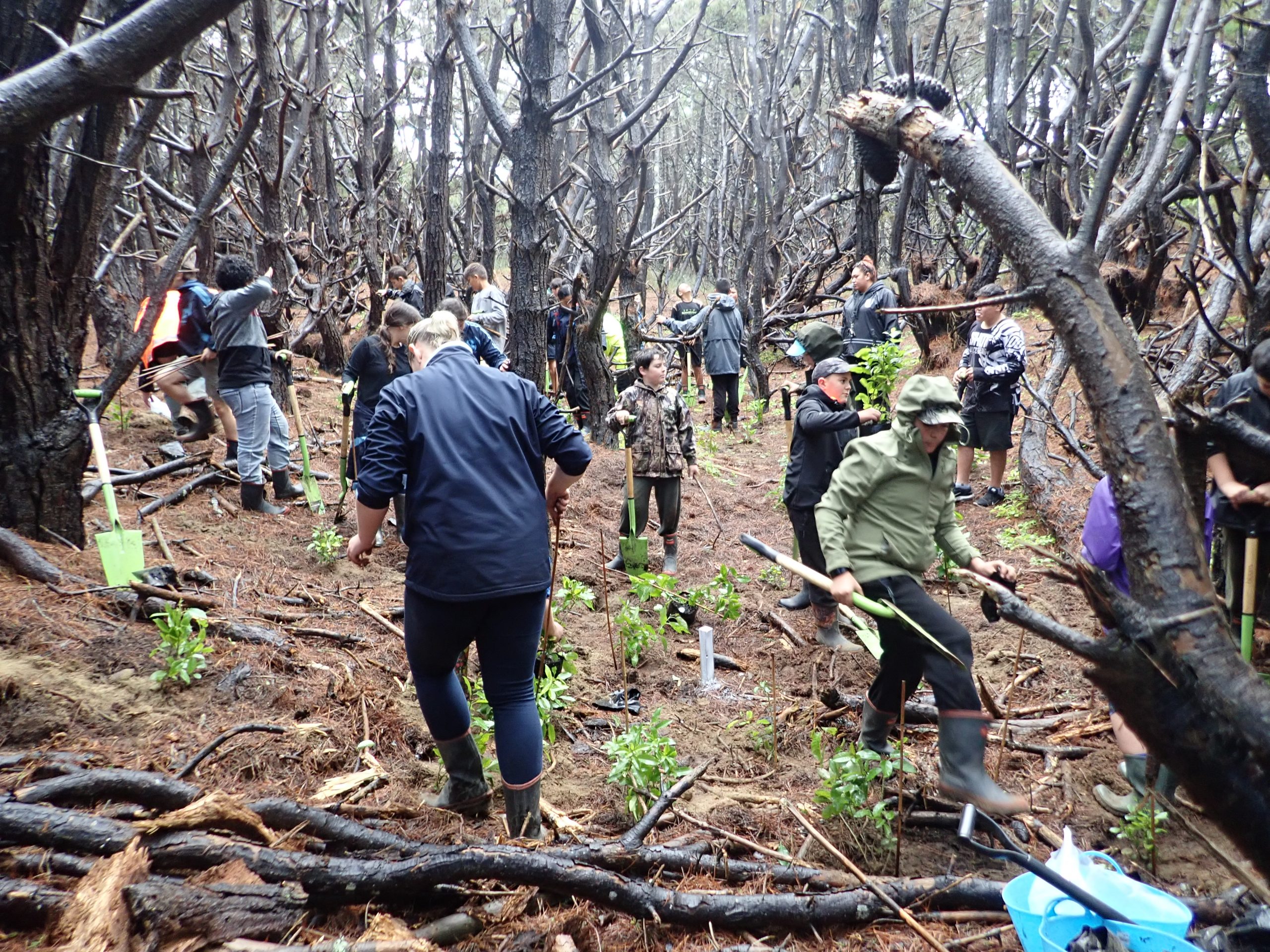 Research is still needed to clarify the most efficient and cost-effective methods for enhancing forest transition and which sites will be successful, particularly with harsh environments like duneland. Tāne’s Tree Trust is currently undertaking a Coastal Buffers Sustainable Farming Fund project. Many of the sacrificial exotic buffers planted in the 1970s that protect today’s duneland plantation forests from the salt wind are beginning to fail. The Tāne’s Tree Trust project is investigating whether these old buffer pines can be utilised to boost the establishment of a replacement indigenous coastal buffer. Initial results are promising. If the exotic buffer conditions allow indigenous canopy species to establish this will mean that highly threatened coastal duneland forest may be able to be restored several decades ahead of similar restoration efforts that start from scratch establishing early successional growth first.