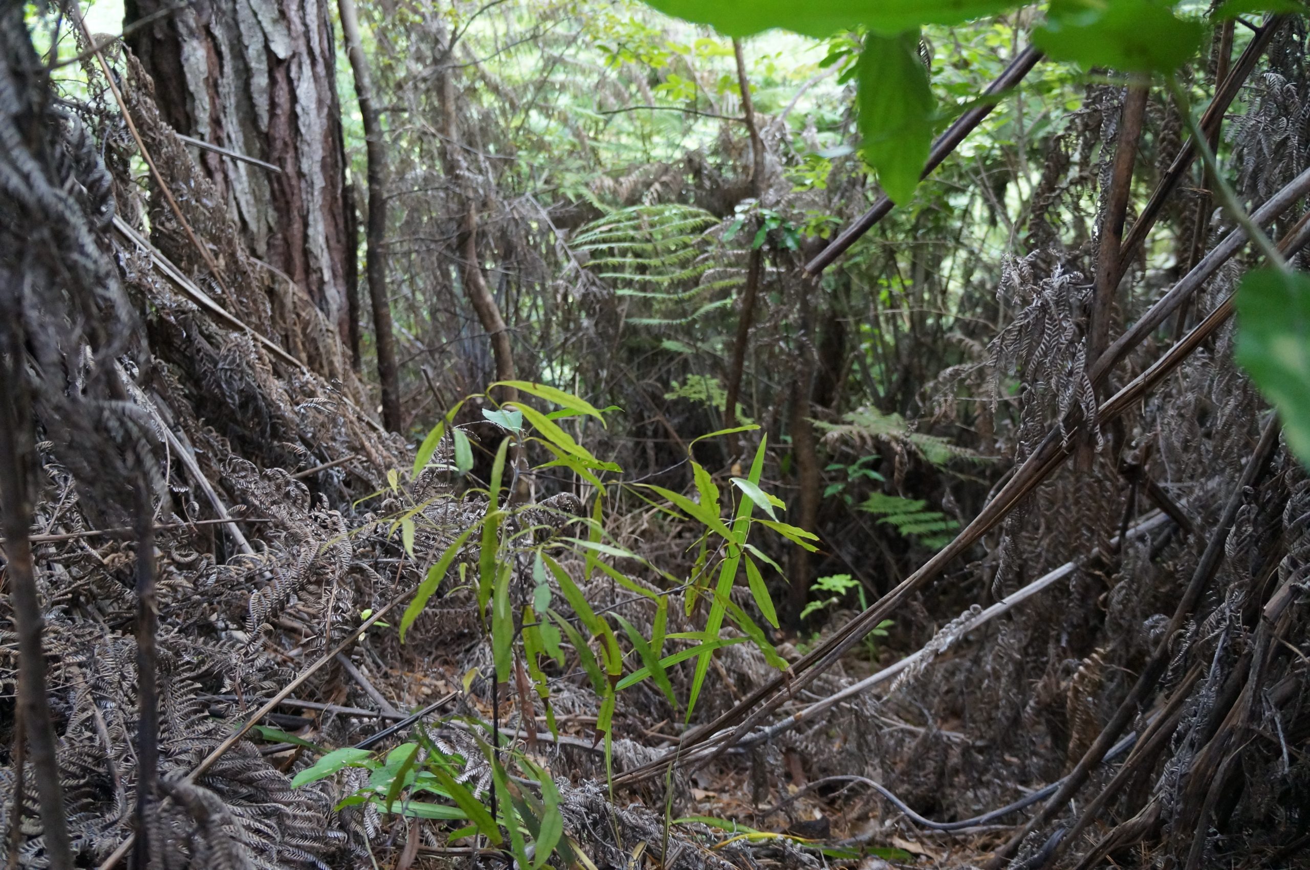 A mature Pinus radiata plantation forest provides a sheltered and shady environment. Where native seed sources are nearby, shade-requiring native canopy trees can potentially establish here decades before they would in a post-clearfell scenario. The fast-growing pines initially cut out the light for shade-intolerant weed species beneath suppressing their growth. Within two decades the pines develop a tall canopy that begins to let in some light, providing the right conditions for native vegetation to establish. As Pinus radiata seedlings require high light levels to germinate they are also suppressed by the initial pine crop and the regenerating native forest. Pinus radiata can live for up to 150 years but as long as the native forest succession is uninterrupted by fire, lack of seed source or browsers, the native vegetation will begin to dominate.