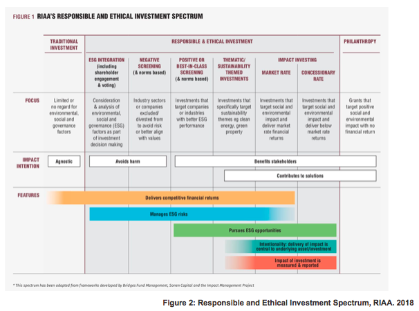 The RIAA depicts âResponsible and Ethical Investmentâ along a spectrum, bookended by âTraditional Investmentâ at one end, where investments are agnostic to social or environmental impacts, and âPhilanthropyâ at the other, where grants (âgifts with objectivesâ) are made to fund social or environmental impacts without any expectation of a financial return.