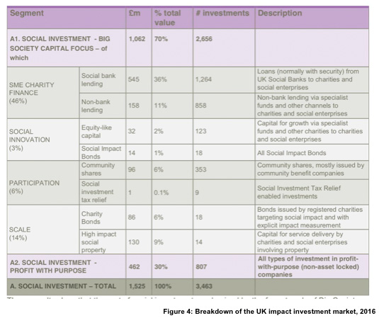 Big Society Capital (BSC) is the UKâs impact investment wholesaler and a market building organisation. To get a sense of how our impact investing market might look like in the future, it is interesting to review BSCâs data on the break down of the UK market, that they value at around ÂŁ1.5bn in 2016.